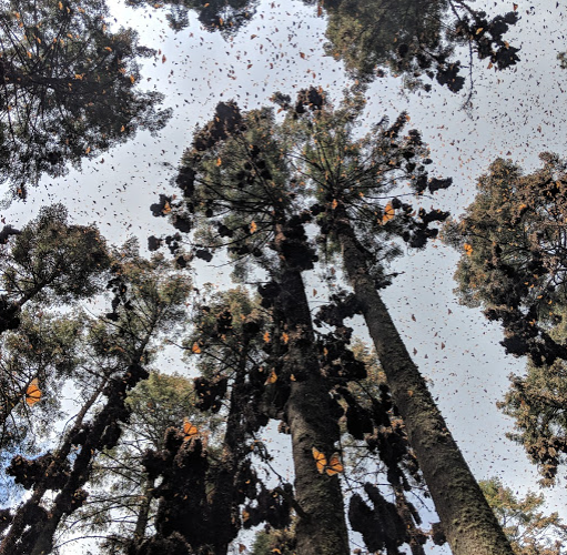 Tales from the Journey On a quiet February morning, we hiked along a small scenic trail passing new plant species, and glimpsing expansive overlooks. With each step we knew we were closer to seeing overwintering Monarchs, but we were unable to comprehend exactly what we would be seeing. Up and up our breath heavy, our bodies not yet accustomed to the altitude, around a short bend, and there, above, the first sighting of clumps. Large masses overwhelming the branches of the local Oyamel fir trees, and all around them bright orange flittering wings... breathtaking. With hearts full and eyes blurred with tears we trekked closer, our guide leading us to a high vantage point allowing each of us to take in the vast spread of delicate creatures. The Sanctuary at Sierra Chincua was a beautiful rustic introduction to the environment of the overwintering Monarch.
